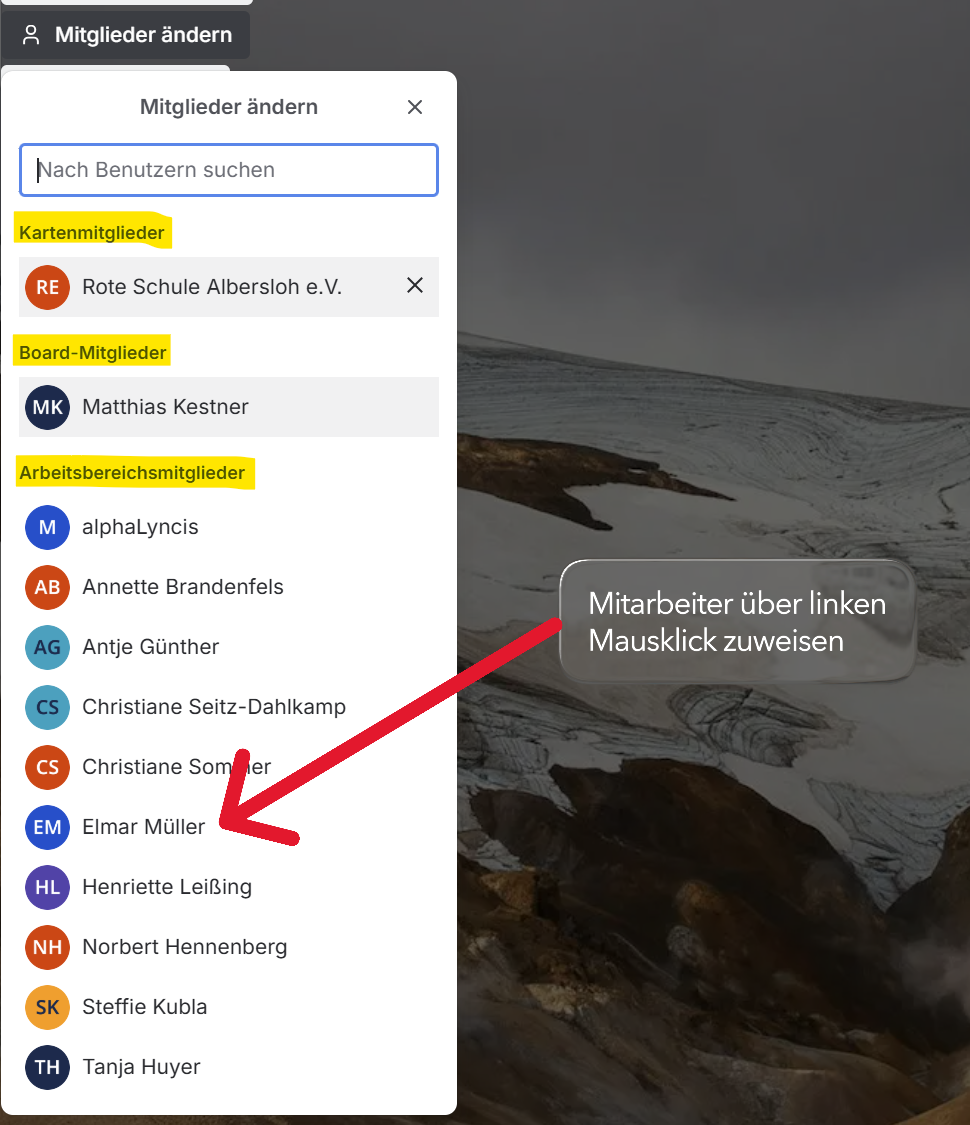 Hier einfach im Bereich "Board-Mitglieder"  oder "Arbeitsbereichsmitglieder" auf den Mitarbeiter klicken, der zugewiesen werden soll.