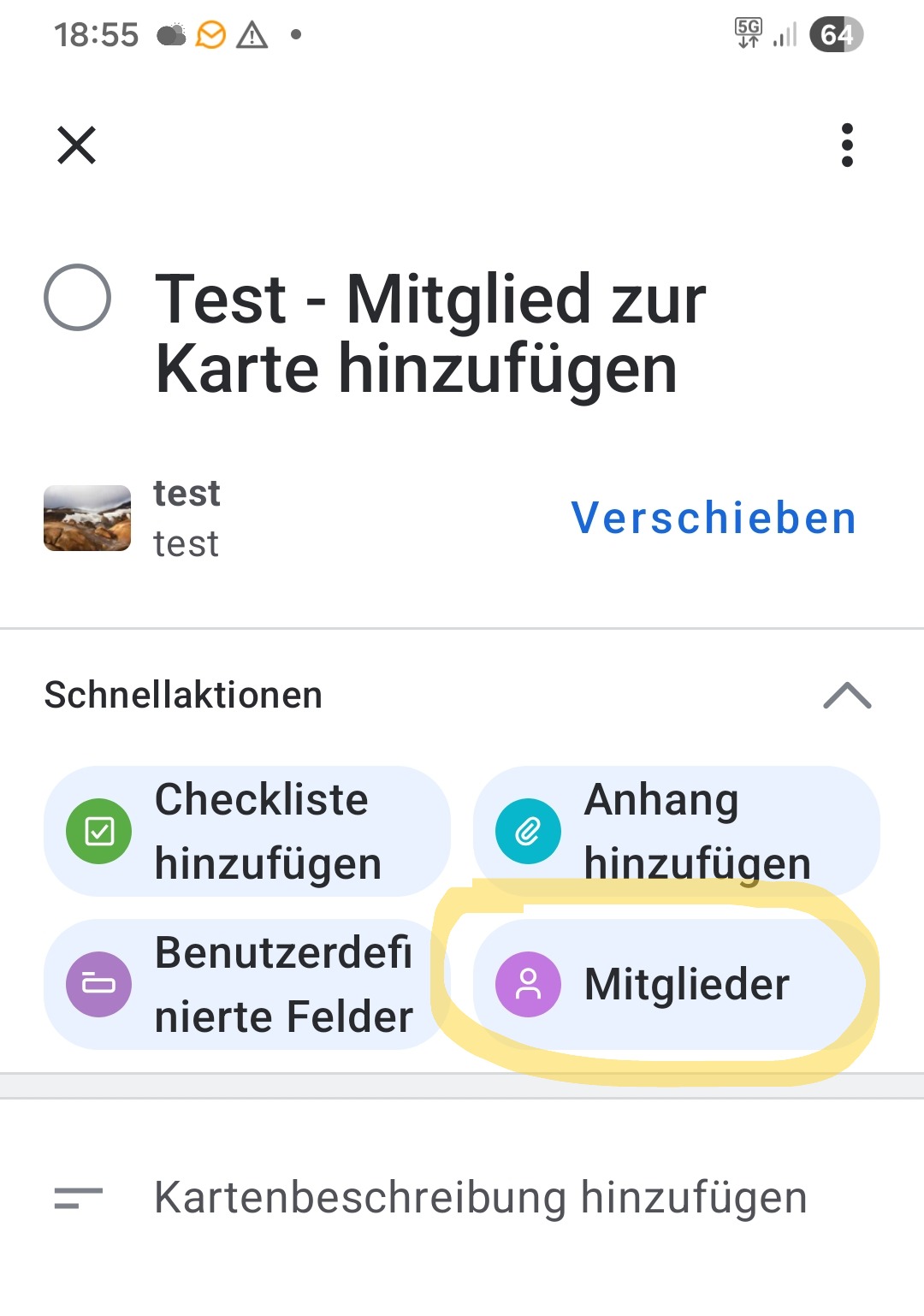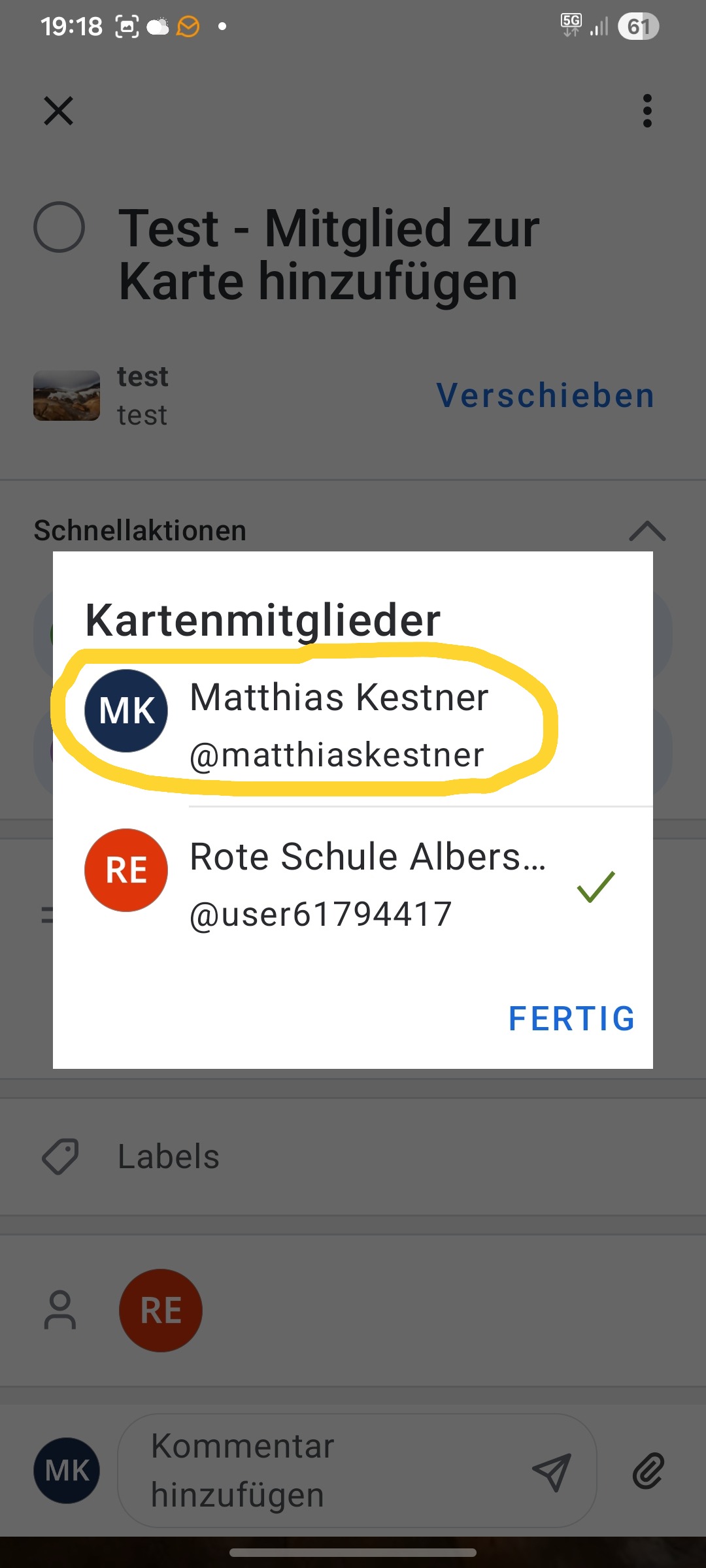 5. Klicke auf den Mitarbeiter, der zur Karte hinzugefügt werden soll. Im Unterschied zur Browserversion (s.o.) ist, dass hier nur die Mitarbeiter aus wählbar sind, welche schon dem Board zugewiesen sind (s. Wie macht man sich zum Boardmitglied).